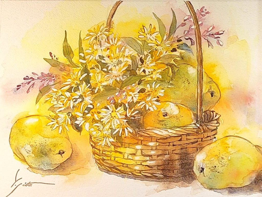峠を越えて出会った風景 投稿日時: 2025年9月15日 投稿者: yukiko 返信 4年ほど前の春に岡山と鳥取の県境で 撮った写真を元に描きました。 季節を晩秋に変えて、柿やススキを 配置してみました。